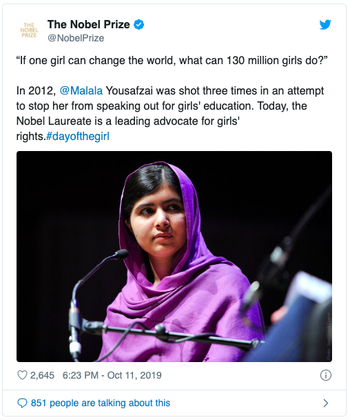 Sicuramente ha fatto sua questa lezione Malala Yousafzai, insignita del premio Nobel per la Pace nel 2014 diventando, a 17 anni, la più giovane vincitrice di un premio Nobel per la sua lotta per il diritto di tutti i bambini all’istruzione, che incoraggia le ragazze dicendo: “Se una ragazza può cambiare il mondo, cosa possono fare 130 milioni di ragazze?”